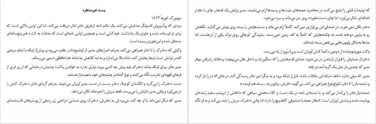 امشب آخرین اجرای یک برنامه‌ی خیلی محدود است. پِراُسْپِروی افسونگر مدتی است لندن را مستفیض نکرده و رزروها فقط برای یک هفته از اجراهاست، بدون اجرا درطولِ روز. بلیت‌ها، بااین‌که قیمت سرسام‌آوری برایشان تعیین شده، به‌سرعت فروش رفتند و تئاتر پُرِ پر شده؛ خیلی از زنان بادبزن‌هایشان را در دست نگه‌ داشته‌اند تا دکلته‌شان را باد بزنند و گرمای سنگینی را که به‌رغم خنکای پاییزیِ بیرون فضا را پر کرده پس برانند. در زمان خاصی درطولِ شب، هرکدام از آن بادبزن‌ها ناگهان پرنده‌ای کوچک می‌شود، تا جایی که دسته‌هایی از آن‌ بادبزن‌ها در سالن تئاتر، درمیانِ تشویقی پرغوغا، حلقه می‌زنند. وقتی هریک از پرنده‌ها برمی‌گردد و دوباره به‌شکل بادبزنی جمع‌شده روی پای صاحبش می‌افتد، تشویق فقط بیشتر می‌شود، بااین‌که بعضی‌ها آن‌قدر متحیرند که نمی‌توانند دست بزنند. این‌ها بادبزن‌های توری و پَردار را شگفت‌زده در دستانشان جابه‌جا می‌کنند و دیگر اصلاً متوجه گرما نیستند. مردی که کت خاکستری به تن دارد و در جایگاه سمت چپ صحنه نشسته تشویق نمی‌کند؛ نه برای این، نه برای هیچ شعبده‌ی دیگری درطولِ شب. مردِ روی سکو را با نگاه خیره‌ی مداوم و موشکافانه‌ای تماشا می‌کند که هیچ‌وقت در تمام طول اجرا تغییری نمی‌کند. او حتی یک بار هم دستان دستکش‌پوشش را برای کف‌زدن بلند نمی‌کند. با دیدن کارهایی که باعث می‌شود تماشاچی‌های مسحور دست بزنند یا نفس‌ در سینه حبس کنند یا گاهی جیغی از سر غافل‌گیری بکشند حتی ابرویش را هم بالا نمی‌دهد. بعد از این که اجرا خاتمه می‌یابد، مرد کت‌خاکستری به‌راحتی راهش را ازمیانِ ازدحام جمعیت در لابیِ سالن باز می‌کند. از دری پرده‌دار عبور می‌کند و بدون آن‌که ببینندش به اتاق گریم می‌رود.
